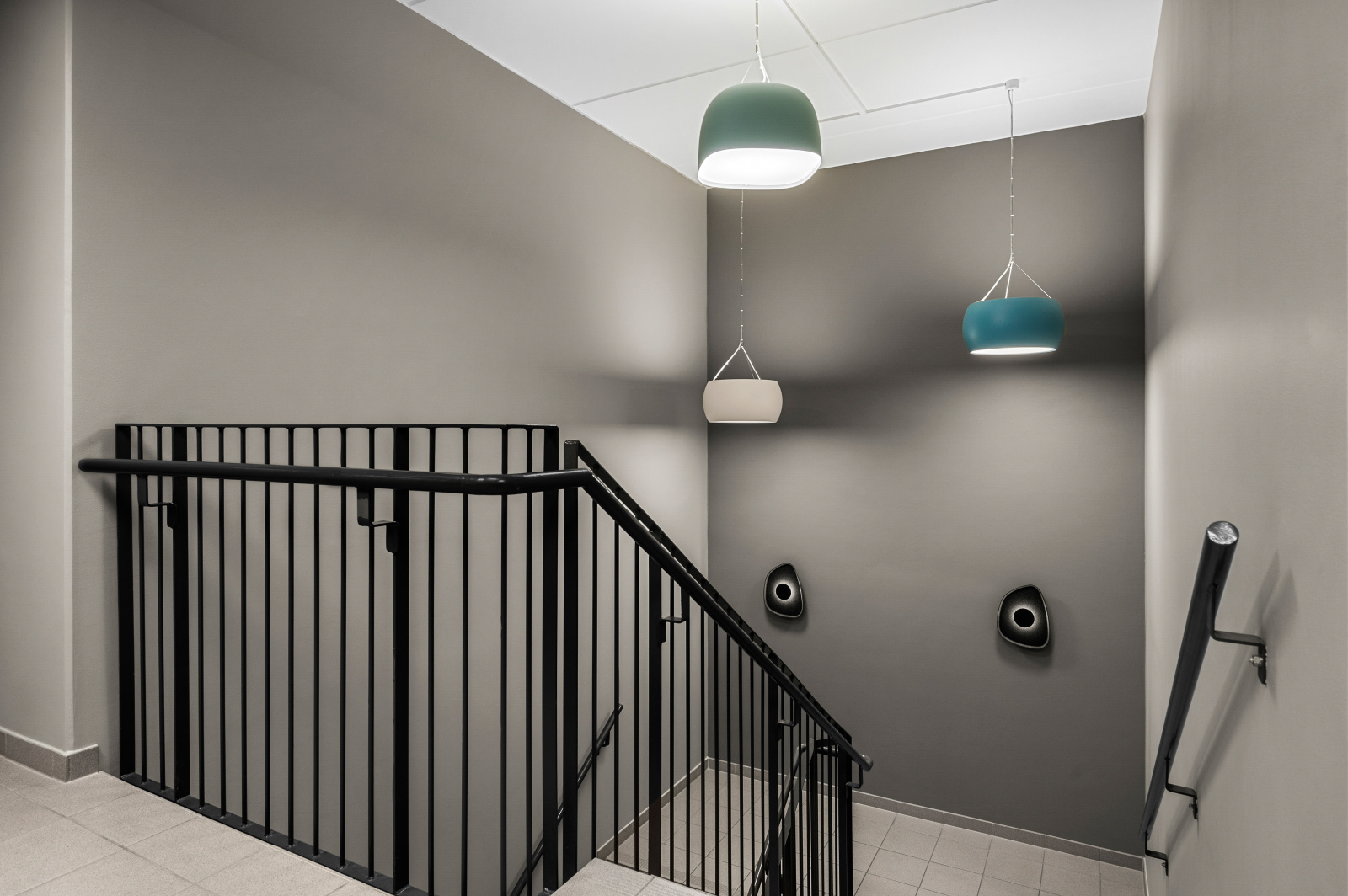 Belysning ihht selskap for lyskultur og ventilasjon leveres som distribuert tilluft med Klimatak (buet metallhimling i del av rommet, der luft blåses inn over himlingen) og sentralt avtrekk. Både belysningen og ventilasjonen er behovsstyrt (bevegelsesføler / VAV). Dette er et ENØK-tiltak der lys og luftmengde styres automatisk, slik at vi bruker minst mulig energi for å levere et best mulig inneklima.